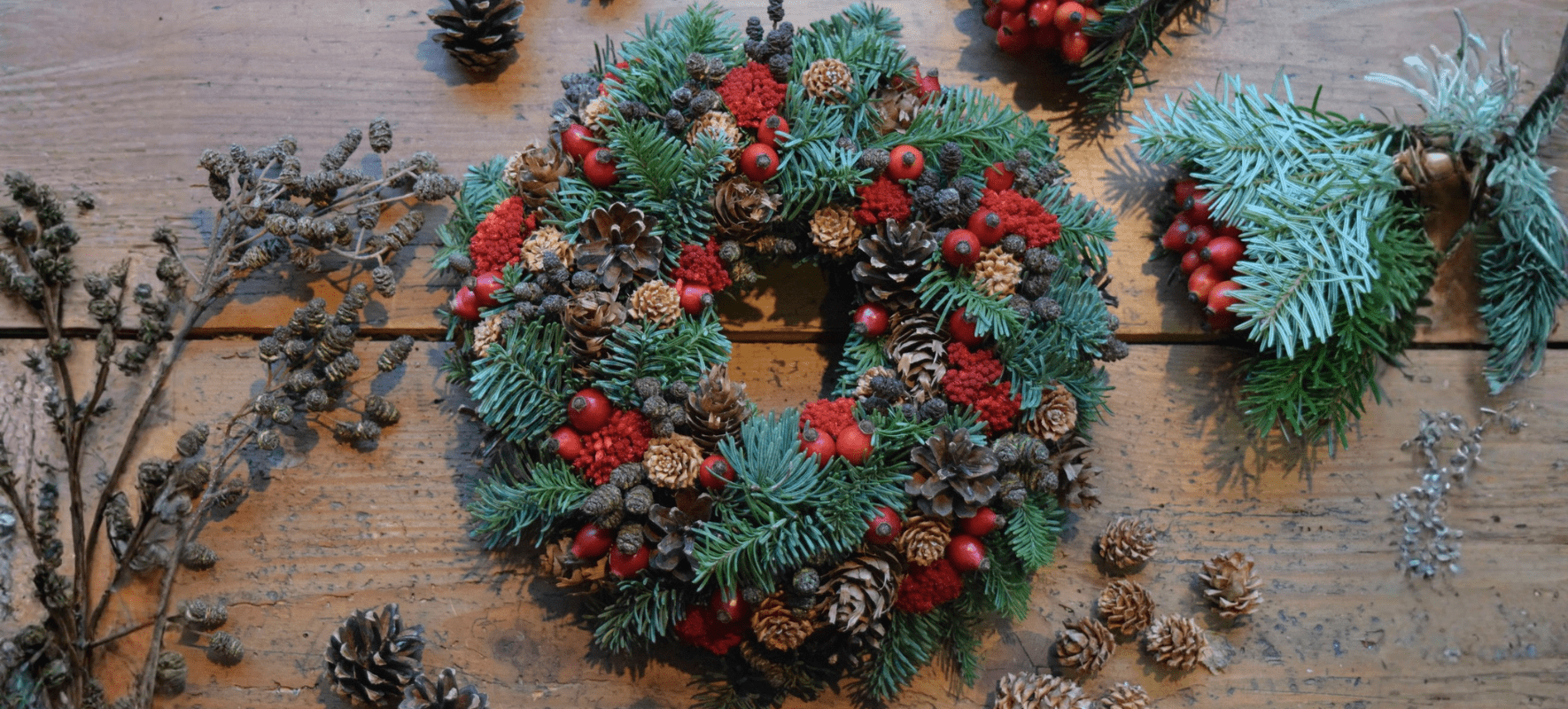 Téli terméses kopogtató készítése örökzöldekből, hagyományos koszorúkötő technikával